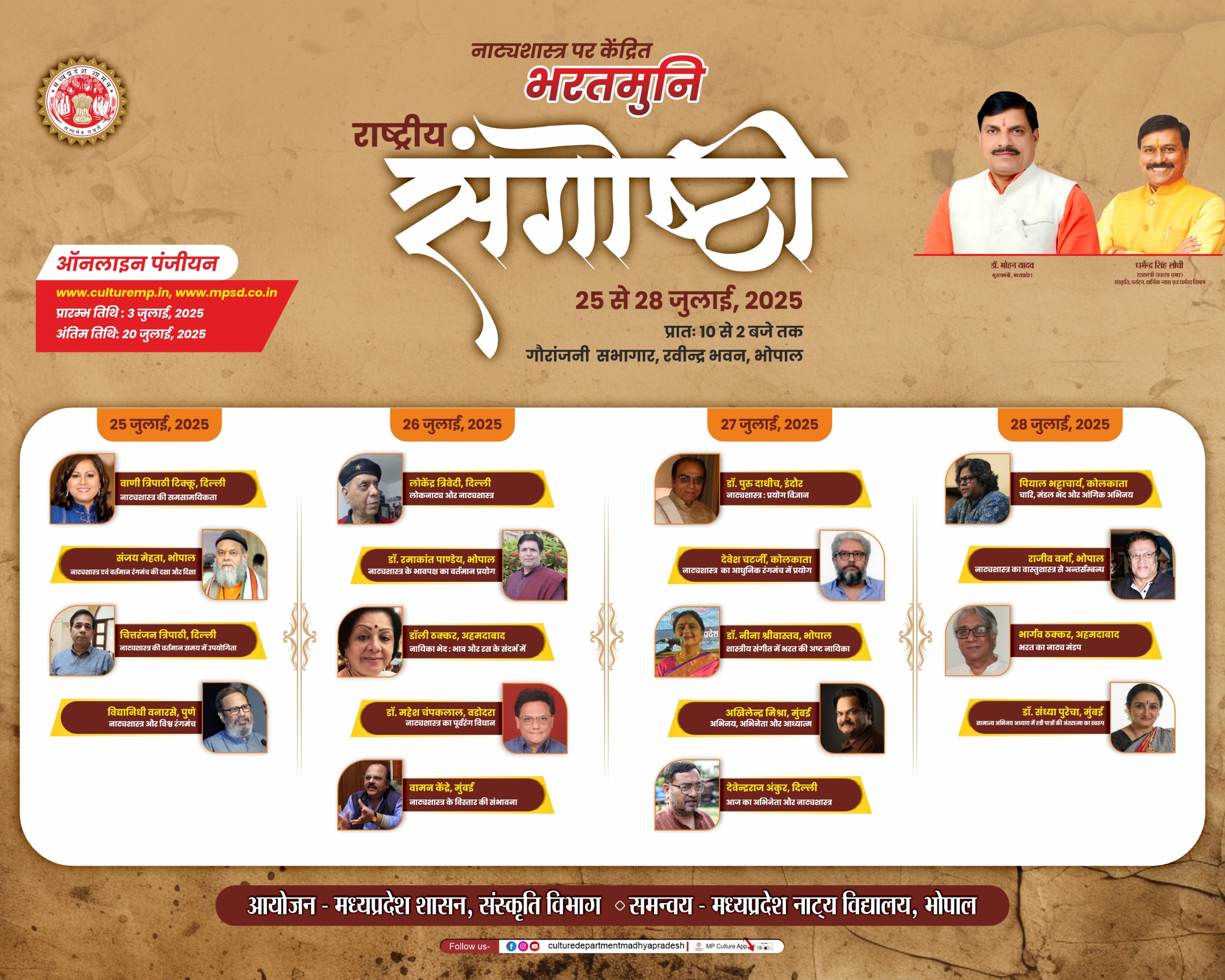25 से 28 जुलाई, 2025 तक गौरांजनी सभागृह, रवीन्द्र भवन भोपाल में नाट्यशास्त्र पर केंद्रित ''राष्ट्रीय संगोष्ठी''